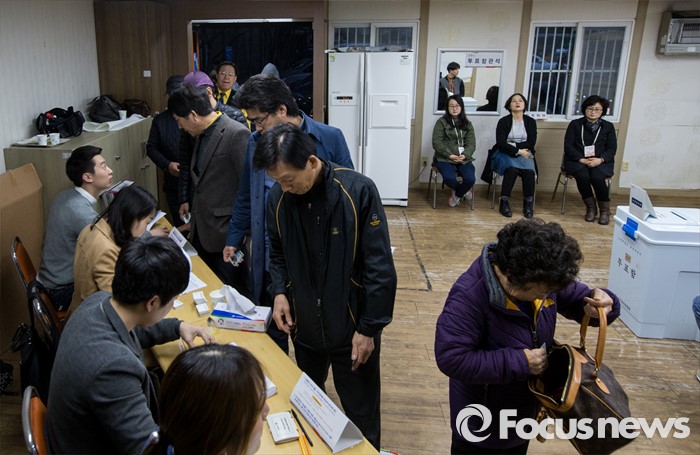 (부산=포커스뉴스) 제20대 국회의원선거일인 13일 오전 부산 영도구 동삼1동 제6투표소에서 유권자들이 본인확인절차를 밟고 있다.