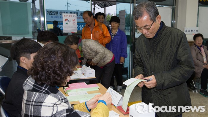 (대전=포커스뉴스) 제20대 국회의원 선거가 시작된 13일 오전 대전 동구 삼성동 제1투표소에서 유권자들이 투표용지를 받고 있다.