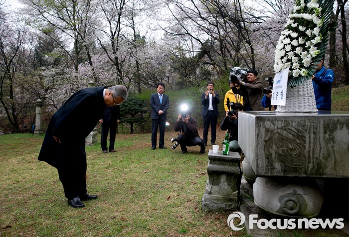 (서울=포커스뉴스) 20대 총선 투표일인 13일 오전 김종인 더불어민주당 비대위 대표 겸 선대위원장이 서울 강북구 수유동에 위치한 자신의 조부인 가인 김병로 선생 묘소를 찾아 성묘를 하고 있다.