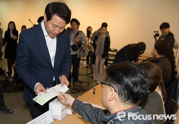 (서울=포커스뉴스) 2016 제20대 국회의원선거날인 13일 오전 서울 종로구 동성고등학교 백주년기념관에 설치된 투표소에서 오세훈 새누리당 종로 후보와 부인인 송현옥 씨가 본인확인 및 투표용지를 받고 있다.