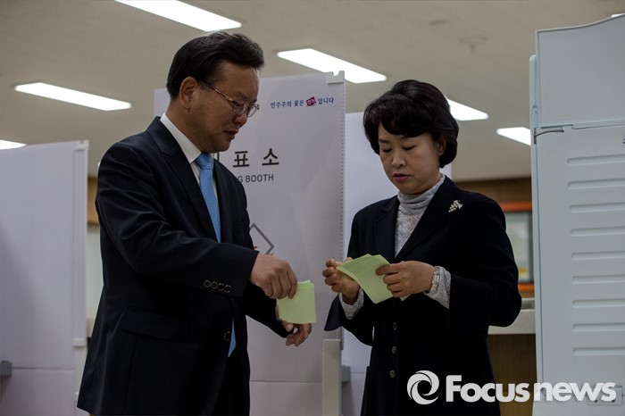 (대구=포커스뉴스) 제20대 국회의원선거날인 13일 오전 대구 수성구 만촌주민센터에 마련된 투표소에서 김부겸 더불어민주당 대구 수성갑 후보가 투표를 하고 있다.