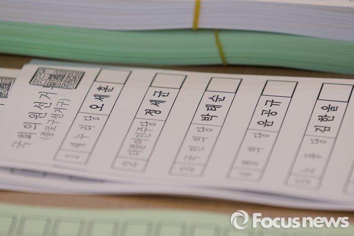 (서울=포커스뉴스) 2016 제20대 국회의원선거날인 13일 오전 서울 종로구 동성고등학교 백주년기념관에 설치된 투표소에 투표용지들이 놓여 있다.