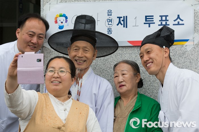 (논산=포커스뉴스) 제20대 국회의원 선거가 시작된 13일 오전 충남 논산 연산면 제1투표소에서 양지서당 유복엽 큰 훈장과 가족들이 투표를 마치고 인증사진을 촬영하고 있다.