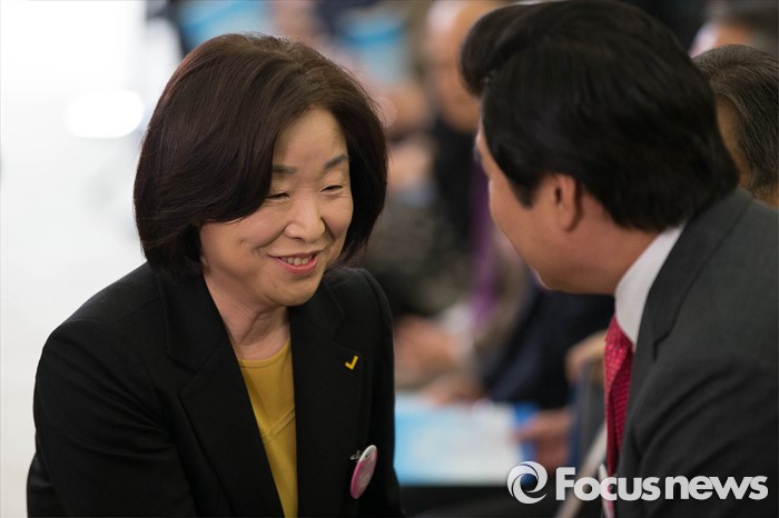 (서울=포커스뉴스) 제20대 국회의원선거일인 13일 오전 서울 용산구 백범기념관에서 열린 대한민국 임시정부 수립 97주년 기념식에 참석한 심상정 정의당 대표와 원유철 새누리당 원내대표가 인사를 나누고 있다.