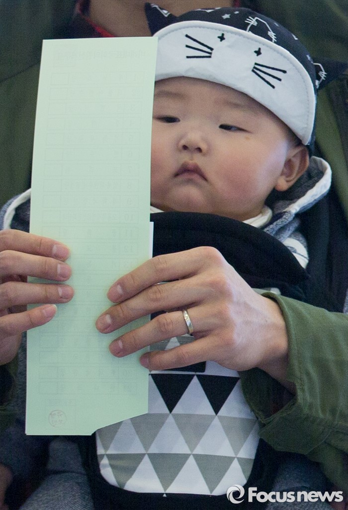 (서울=포커스뉴스) 제20대 국회의원선거일인 13일 오전 서울 광진구 능동 제3투표소에서 한 아이가 투표용지를 바라보고 있다.