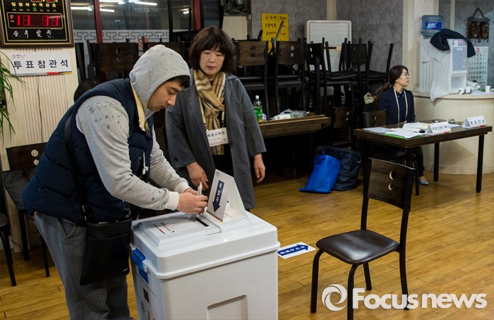 (부산=포커스뉴스) 제20대 국회의원선거일인 13일 오전 부산 사하구 하단1동 제1투표소에서 유권자들이 투표하고 있다. 이 투표소는 하단전통시장 내 한 밀면 음식점에 마련됐다.
