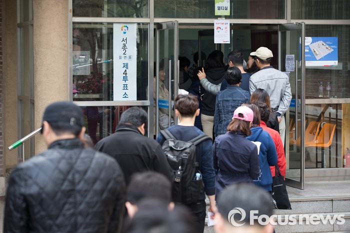 (서울=포커스뉴스) 2016 제20대 국회의원선거날인 13일 오후 서울 서초구 서이초등학교에 마련된 투표소에서 유권자들이 투표를 하기 위해 대기하고 있다.
