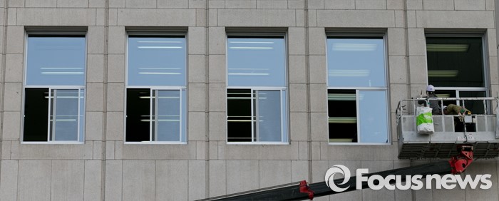(서울=포커스뉴스) 20대 총선 투표일인 13일 오후 서울 여의도 국회 본청에서 업체 관계자들이 창문교체 작업을 하고 있다.