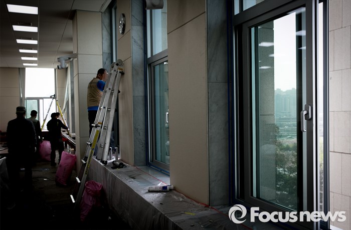 (서울=포커스뉴스) 20대 총선 투표일인 13일 오후 서울 여의도 국회 본청에서 업체 관계자들이 창문교체 작업을 하고 있다.