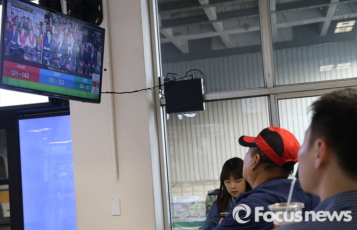 (서울=포커스뉴스) 제20대 국회의원선거일인 13일 오후 서울 서초구 고속터미널에서 시민들이 출구조사 발표 방송을 시청하고 있다.