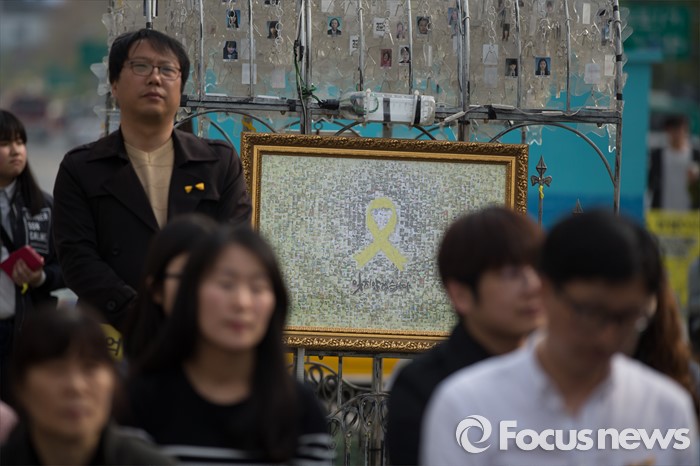 (서울=포커스뉴스) 제20대 국회의원선거날인 13일 오후 서울 종로구 광화문 광장에서 열린 세월호 2주기 추모행사 세월호 낭독회에서 시민들이 시인의 낭독을 듣고 있다.