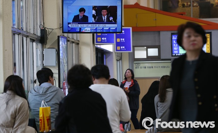 (서울=포커스뉴스) 제20대 국회의원선거일인 13일 오후 서울 서초구 고속터미널에서 시민들이 출구조사 발표 방송을 시청하고 있다.