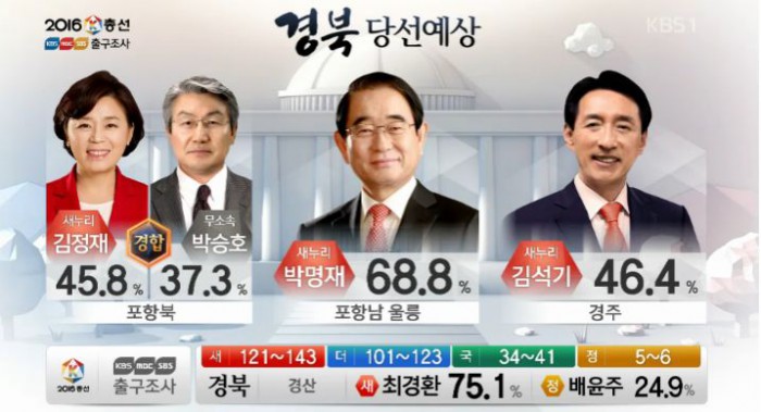 (서울=포커스뉴스) 13일 오후 6시 KBS·MBC·SBS 지상파 방송3사가 공동조사, 발표한 4·13 총선 출구조사 결과에 따르면 경북 포항북 지역구에서는 김정재 새누리당 후보가 45.8%로 박승호 무소속 후보(37.3%)와 경합 중으로 나타났다.<사진출처=KBS 출구방송 화면캡쳐>