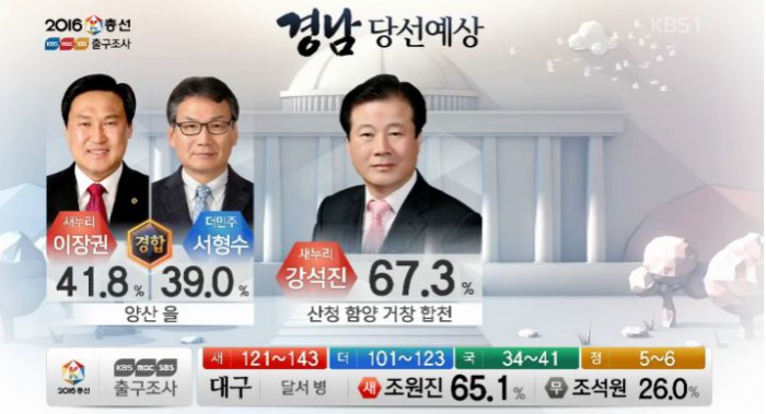 (서울=포커스뉴스)13일 오후 6시 KBS·MBC·SBS 지상파 방송3사가 공동조사, 발표한 4·13 총선 출구조사 결과에 따르면 경남 산청·함양·거창·합천 지역구에서는 강석진 새누리당 후보가 67.3%로 당선이 유력한 것으로 나타났다.<사진출처=KBS 출구방송 화면캡쳐>