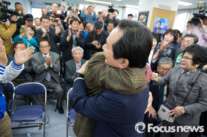 (서울=포커스뉴스) 제20대 국회의원선거일인 13일 오후 정세균 더불어민주당 종로구 후보가 서울 종로구 자신의 사무실에서 지지자들과 포옹하고 있다.