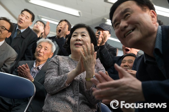 (서울=포커스뉴스) 제20대 국회의원선거일인 13일 오후 서울 종로구 정세균 더불어민주당 종로구 후보의 사무실에서 지지자들이 개표방송을 보고 환호하고 있다.
