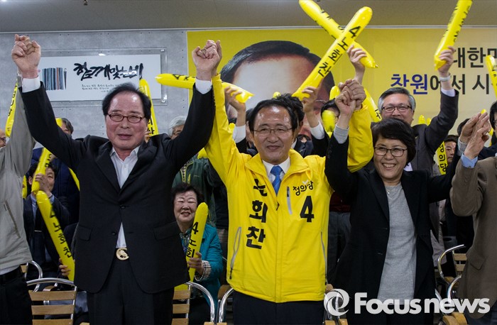 (창원=포커스뉴스) 제20대 국회의원선거가 끝난 13일 오후 창원시 성산구의 선거사무소에서 노회찬 정의당 창원 성산구 후보가 '예측 당선'이라는 방송사 출구조사 결과에 지지자들과 함께 기쁨을 표하고 있다. 노 후보의 좌측은 권영길 전 민주노동당 대표, 우측은 부인 김지선 씨.