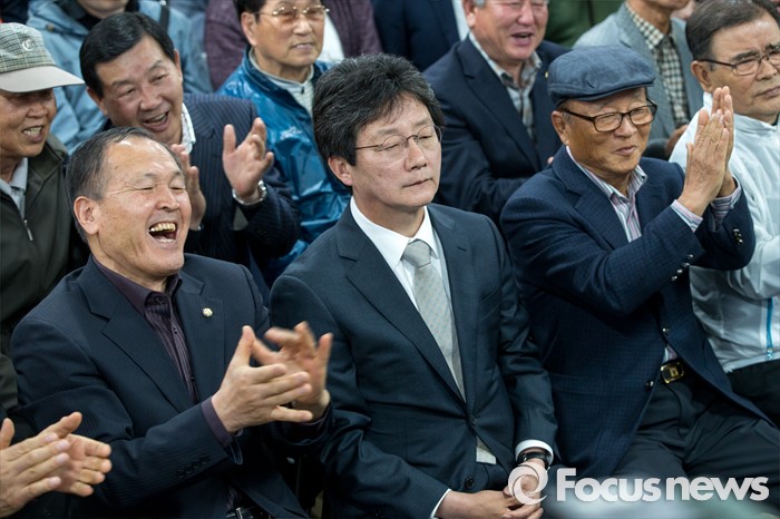 (대구=포커스뉴스) 제20대 국회의원선거 출구조사를 통해 유승민 무소속 대구 동구을 후보가 당선이 예측된 13일 오후 대구 동구 유 후보 선거사무소에서 유승민 후보가 지지자들의 축하를 받고 있다.