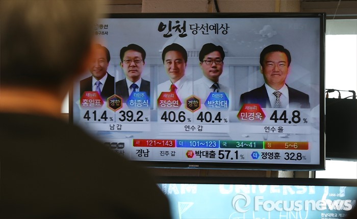 (서울=포커스뉴스) 제20대 국회의원선거일인 13일 오후 서울 서초구 고속터미널에서 시민들이 출구조사 결과발표 방송을 시청하고 있다.