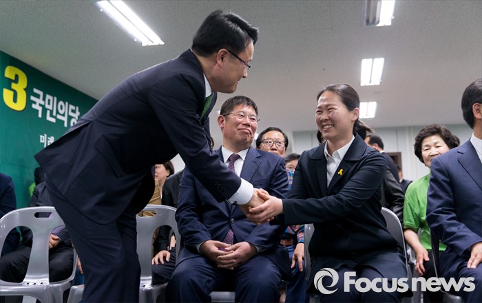 (광주=포커스뉴스) 제20대 국회의원 선거일인 13일 오후 광주 서구 국민의당 광주광역시당에서 권은희(오른쪽) 광주 광산구을 후보와 송기석 서구갑 후보가 인사를 나누고 있다.