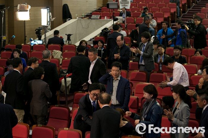 (서울=포커스뉴스) 20대 총선 투표일인 13일 오후 서울 여의도 국회 의원회관 대회의실에 마련된 더불어민주당 개표상황실에서 김종인 비대위 대표 겸 선대위원장이 출구조사 및 개표방송을 시청한 뒤 퇴장하고 있다.
