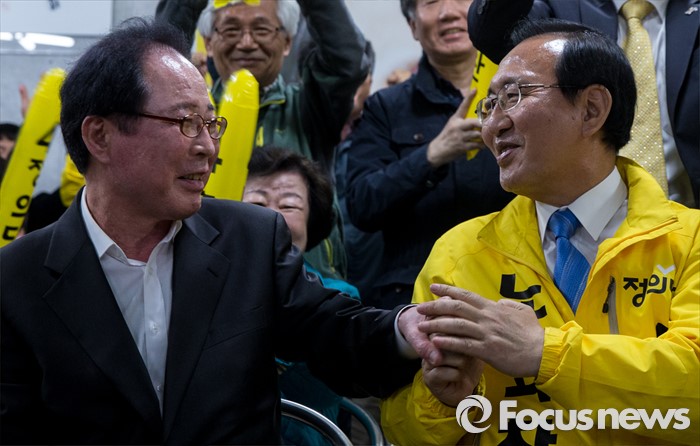 (창원=포커스뉴스) 제20대 국회의원선거가 끝난 13일 오후 창원시 성산구의 선거사무소에서 노회찬 정의당 창원 성산구 후보가 '예측 당선'이라는 방송사 출구조사 결과에 권영길 전 민주노동당 대표와 기쁨을 나누고 있다.
