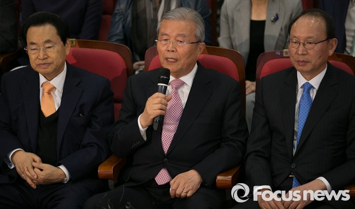 (서울=포커스뉴스) 20대 총선 투표일인 13일 오후 서울 여의도 국회 의원회관 대회의실에 마련된 더불어민주당 개표상황실에서 김종인 비대위 대표 겸 선대위원장이 출구조사 및 개표방송을 시청한 뒤 소감을 전하고 있다. 왼쪽부터 송현섭 부위원장, 김 대표, 최운열 국민경제상황실장.