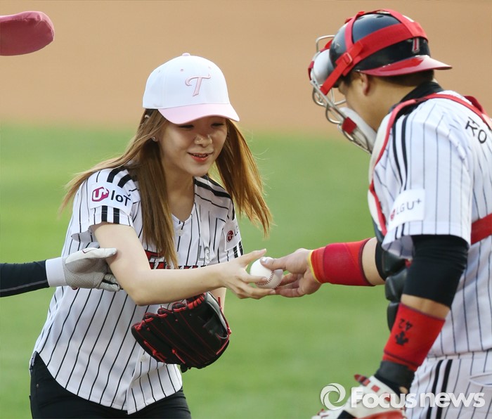 (서울=포커스뉴스) 13일 서울 잠실구장에서 열린 2016 프로야구 롯데-LG 경기에서 가수 타이니가 시구후 LG 포수 정상호에게서 공을 돌려 받고 있다.