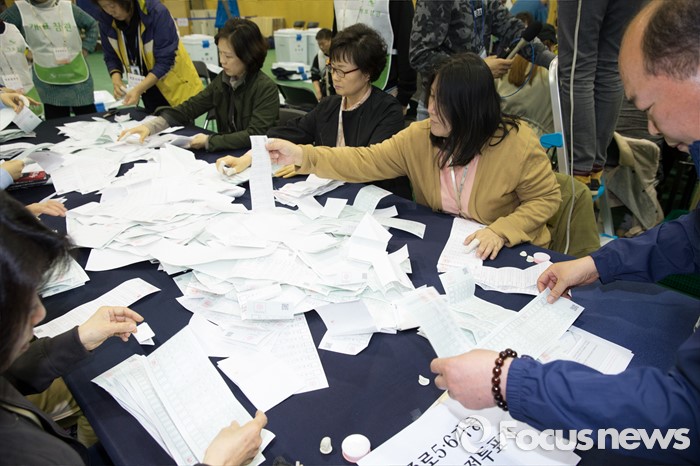 (서울=포커스뉴스) 제20대 국회의원선거일인 13일 오후 서울 종로구 경기상업고등학교 체육관에 마련된 개표소에서 종로구 선거관리위원회 관계자들이 개표하고 있다.