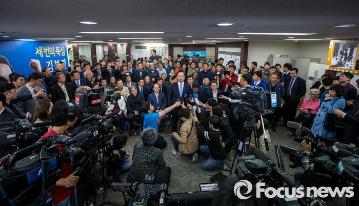 (대구=포커스뉴스) 제20대 국회의원선거 출구조사를 통해 김부겸 더불어민주당 대구 수성갑 후보가 김문수 새누리당 대구 수성갑 후보를 제치고 당선이 예측된 13일 오후 대구 수성구 김 후보 선거사무소에서 김부겸 후보가 취재진과 인터뷰 하고 있다.