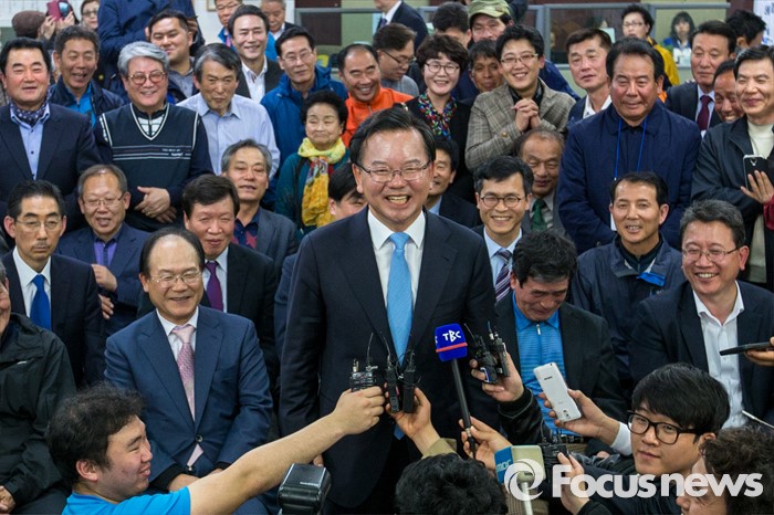 (대구=포커스뉴스) 제20대 국회의원선거 출구조사를 통해 김부겸 더불어민주당 대구 수성갑 후보가 김문수 새누리당 대구 수성갑 후보를 제치고 당선이 예측된 13일 오후 대구 수성구 김 후보 선거사무소에서 김부겸 후보가 취재진과 인터뷰 하고 있다.