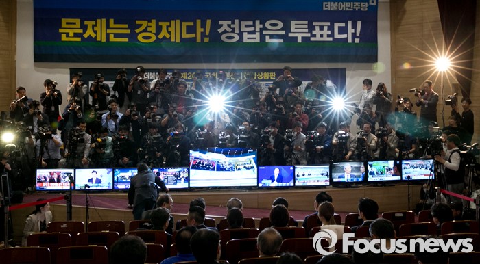 (서울=포커스뉴스) 20대 총선 투표일인 13일 오후 서울 여의도 국회 의원회관 대회의실에 마련된 더불어민주당 개표상황실에서 취재진이 김종인 비대위 대표 겸 선대위원장 등 선대위원들의 출구조사 및 개표방송을 시청하는 모습을 취재하고 있다.