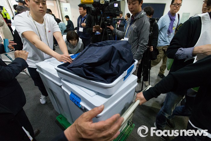 (서울=포커스뉴스) 제20대 국회의원선거일인 13일 오후 서울 종로구 경기상업고등학교 체육관에 마련된 개표소에서 종로구 선거관리위원회 관계자들이 투표함을 옮기고 있다.