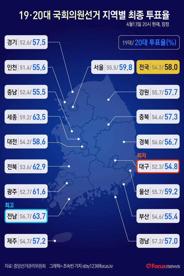 | △ [그래픽] 19·20대 국회의원선거 지역별 최종 투표율 |
