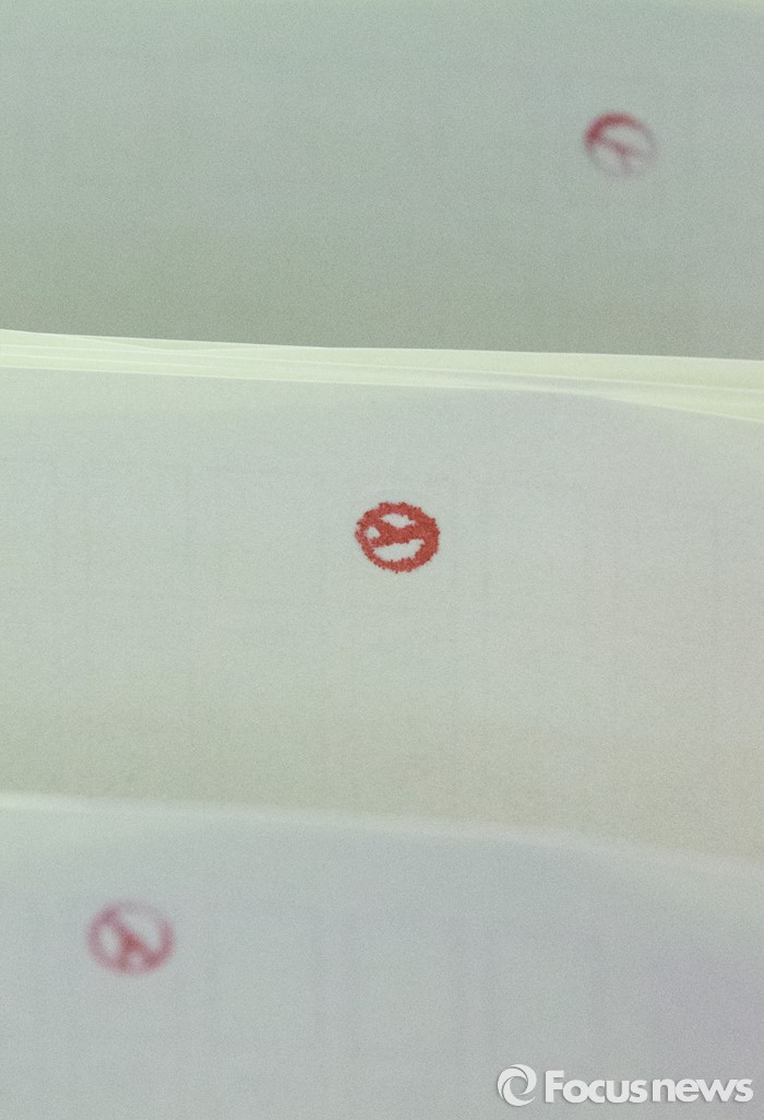 (서울=포커스뉴스) 제20대 국회의원선거일인 13일 오후 서울 은평다목적체육관에 마련된 개표소에서 전자개표기로 분류된 비례대표 투표용지에 도장이 찍혀있다.