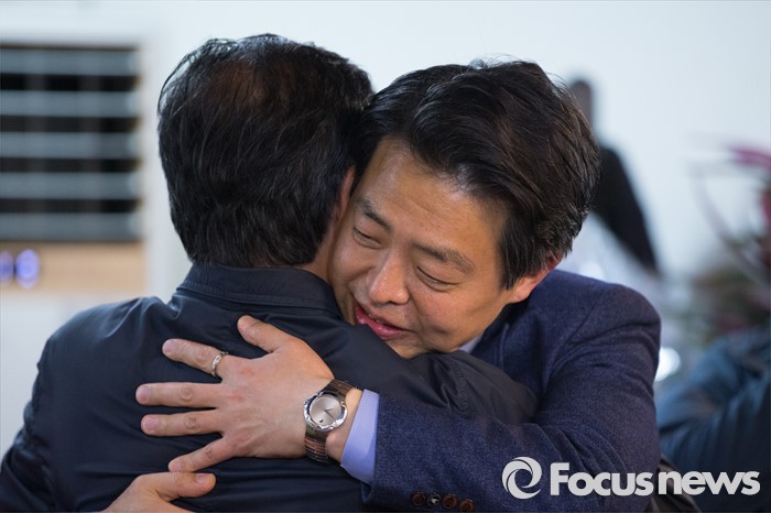 (서울=포커스뉴스) 13일 오후 서울 서대문구 김영호 더불어민주당 서대문구을 후보의 사무실에서 김후보가 지지자와 포옹하고 있다.