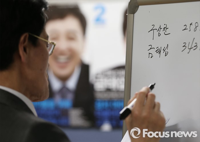 (서울=포커스뉴스) 제20대 국회의원 선거날인 13일 오후 서울 강서구에 위치한 선거사무실에서 한 지지자가 개표상황을 적고 있다.