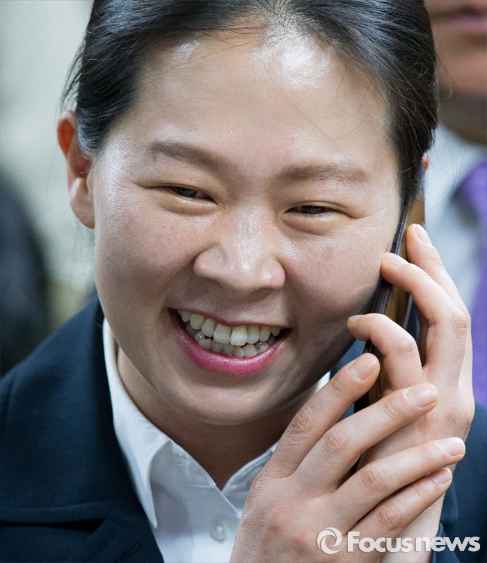 (광주=포커스뉴스) 권은희 국민의당 광주 광산구을 후보가 13일 오후 광주 광산구 수완동 선거사무실에서 당선이 유력해지자 지인으로부터 축하 전화를 받고 있다.