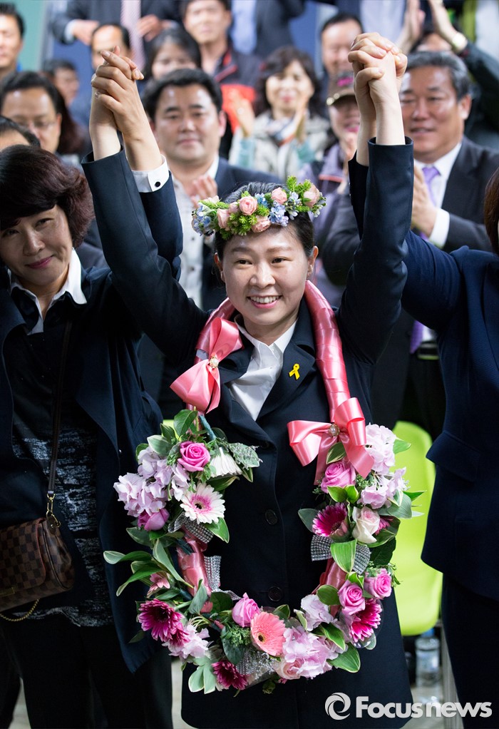 (광주=포커스뉴스) 권은희 국민의당 광주 광산구을 후보가 13일 오후 광주 광산구 수완동 선거사무실에서 당선이 유력해지자 지지자들과 환호하고 있다.