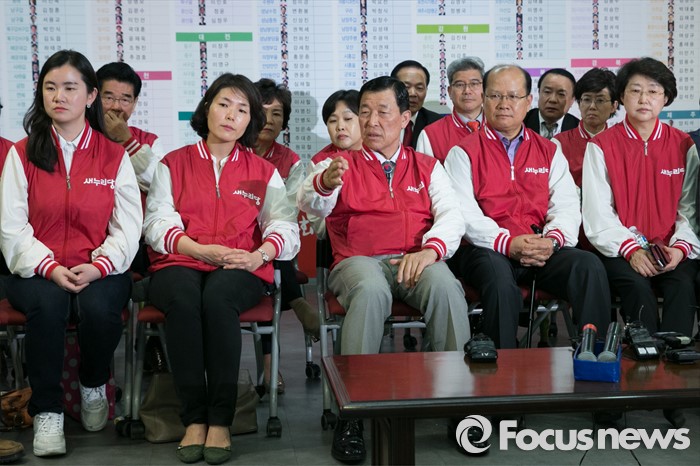 (서울=포커스뉴스) 제20대 국회의원 선거날인 13일 오후 서울 여의도 새누리당사에서 황진하(앞줄 가운데) 사무총장이 개표방송을 시청하며, 신보라(앞줄 왼쪽), 전희경(앞줄 왼쪽 두번째) 비례대표 후보들과 대화하고 있다.