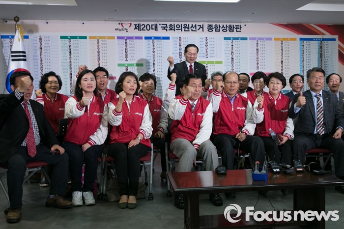 (서울=포커스뉴스) 제20대 국회의원 선거날인 13일 오후 서울 여의도 새누리당사에서 황진하(앞줄 가운데) 사무총장이 개표방송을 시청하며, 비례대표 후보들과 화이팅을 외치고 있다.