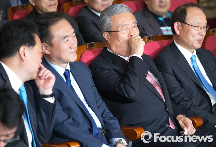 (서울=포커스뉴스) 20대 총선 투표일인 13일 오후 서울 여의도 국회 의원회관 대회의실에 마련된 더불어민주당 개표상황실에서 김종인(오른쪽 두번째) 비대위 대표 겸 선대위원장이 기침을 하고 있다.