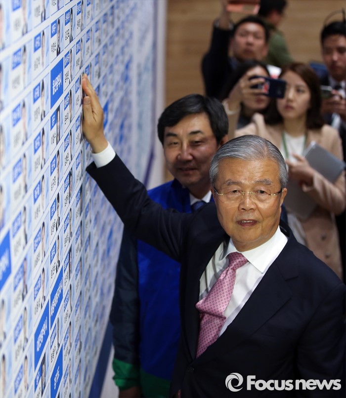 (서울=포커스뉴스) 20대 총선 투표일인 13일 오후 서울 여의도 국회 의원회관 대회의실에 마련된 더불어민주당 개표상황실에서 김종인(오른쪽) 비대위 대표 겸 선대위원장, 이종걸 원내대표가 당선이 확정된 이언주 경기 광명을 후보의 사진 옆에 당선 스티커를 부착하고 있다.