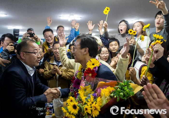 (부산=포커스뉴스) 전재수 더불어민주당 부산 북구강서구갑 후보가 13일 오후 부산 북구 선거사무소에서 당선이 확실시되자 지지자들과 함께 기쁨을 나누고 있다.