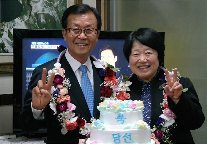 (서울=포커스뉴스) 20대 총선 당선이 확실시된 원혜영 더불어민주당 경기 부천오정구 후보와 부인 안정숙 씨가 13일 오후 경기도 부천 자신의 선거캠프에서 지지자들과 기뻐하고 있다. <사진제공=원혜영 후보 선거사무소>