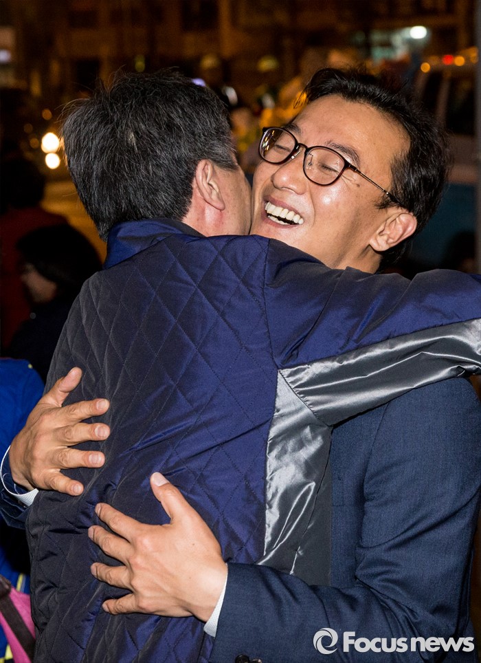 (부산=포커스뉴스) 전재수 더불어민주당 부산 북구강서구갑 후보가 13일 오후 부산 북구 선거사무소에서 당선이 확실시되자 지지자들과 포옹하고 있다.