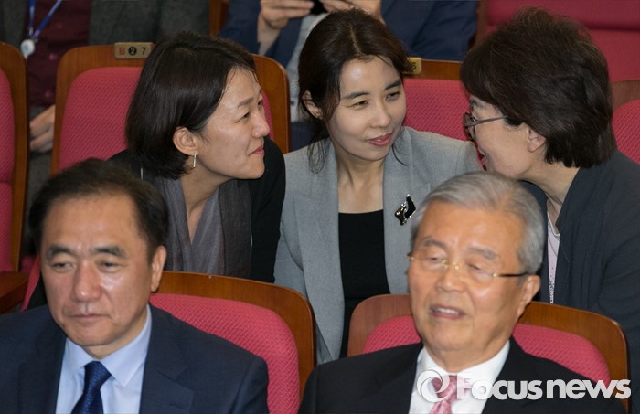 (서울=포커스뉴스) 20대 총선 투표일인 13일 오후 서울 여의도 국회 의원회관 대회의실에 마련된 더불어민주당 개표상황실에서 당선이 확실시된 박경미(뒷줄 가운데), 이재정(뒷줄 왼쪽) 비례대표 후보가 관계자와 대화하고 있다. 오른쪽 아래는 김종인 비대위 대표 겸 선대위원장.