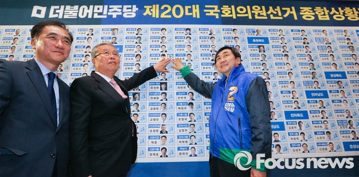 (서울=포커스뉴스) 20대 총선 투표일인 13일 오후 서울 여의도 국회 의원회관 대회의실에 마련된 더불어민주당 개표상황실에서 김종인(가운데) 비대위 대표 겸 선대위원장, 이종걸(오른쪽) 원내대표, 정장선 총선기획단장이 당선이 확정된 이언주 경기 광명을 후보의 사진 옆에 당선 스티커를 부착하고 있다.
