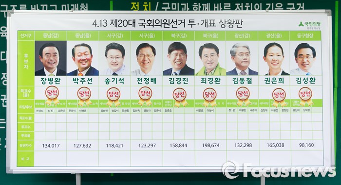 (광주=포커스뉴스) 제20대 국회의원 선거일인 13일 오후 광주 서구 국민의당 광주광역시당에 지역구 후보자들 당선 스티커가 붙어있다. 왼쪽부터 장병완 동구남구갑 당선인, 박주선 동구남구을 당선인, 송기석 서구갑 당선인, 천정배 서구을 당선인, 김경진 북구갑 당선인, 최경환 북구을 당선인, 김동철 광산구갑 당선인, 권은희 광산을 당선인.