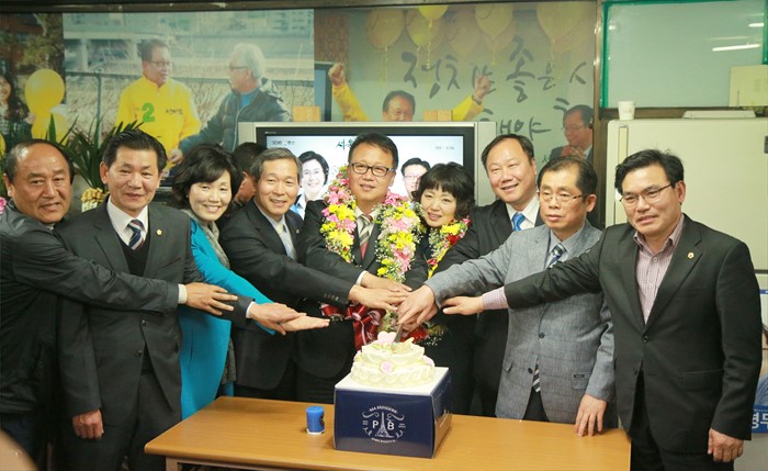 (서울=포커스뉴스) 제20대 국회의원선거일인 13일 민병두 더불어민주당 동대문구을 후보가 당선이 확실시되자 서울 동대문구 자신의 사무소에서 세리머니를 하고 있다. <사진제공=민병두 후보 선거사무소>